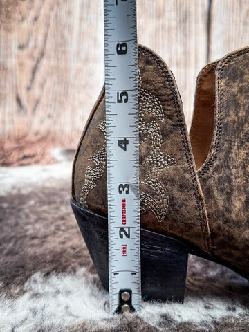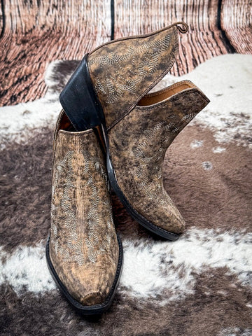 Crafted in a rich crackle brown leather with a distressed bronze finish, these booties bring a worn-in, lived-in look that feels right at home from the first wear. The finish catches the light in all the right waysβlike moonlight reflecting off canyon stoneβand adds that perfect rugged texture that works with denim, dresses, or anything in between.