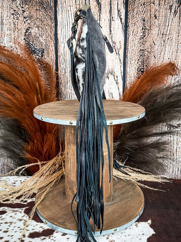 The body of the bag is crafted from hair-on-hide in a striking pattern—rugged and refined all at once. No two bags are the same, thanks to the natural variation in the hide, which makes each piece feel personal and completely unique. Long black fringe down each side gives it movement and edge, adding that extra something that catches the light—and a few compliments along the way.