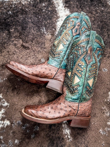 The vamp is crafted from genuine ostrich leather, known for its supple feel, superior durability, and distinctive quill pattern. It’s a luxurious material with grit—grounded in the Western tradition but elevated by its rare texture and rich depth. The shaft erupts in a blaze of geometric embroidery, metallic inlays, and antique studs—all layered against a crackled teal backdrop that feels forged by desert winds and molten sun.