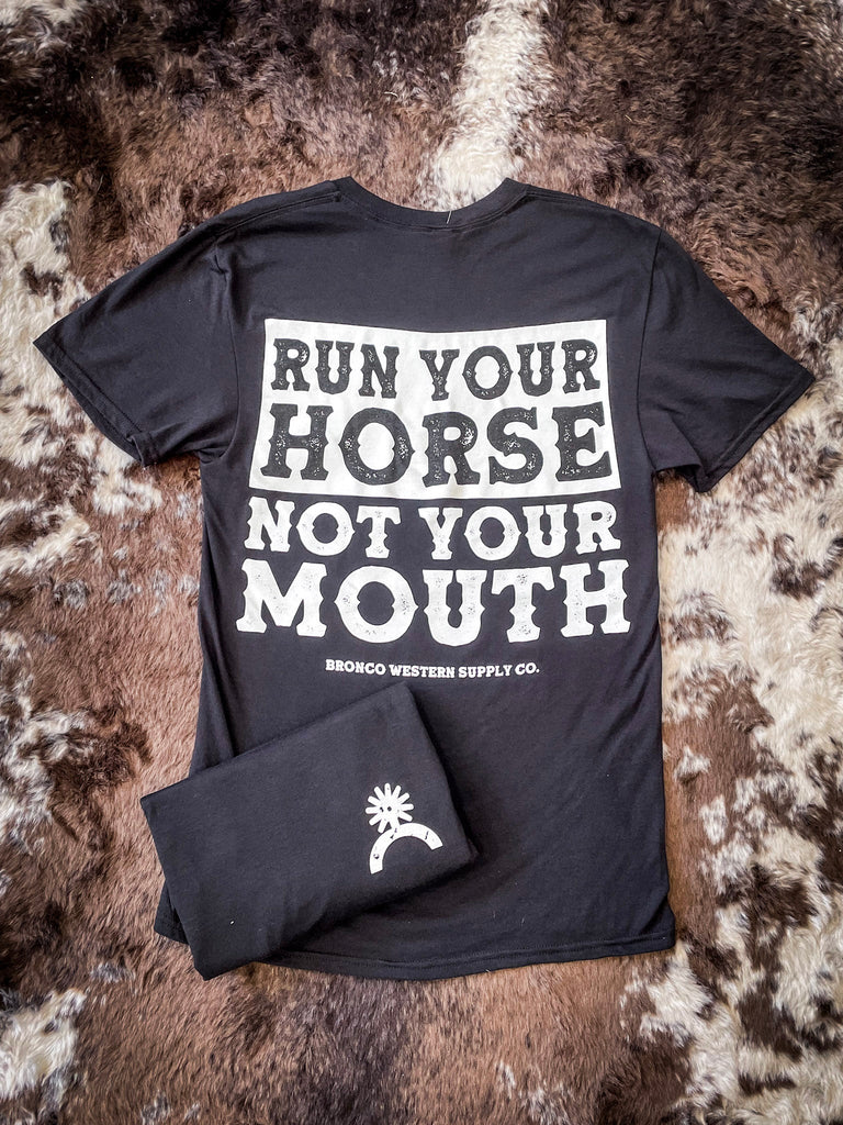 • Run Your Horse Not Your Mouth graphic on the back and Spur logo on left chest
