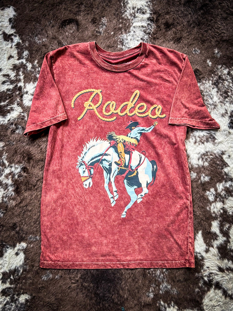 Embrace the thrill of the rodeo with our Saddle Bronc Rodeo Graphic Tee in Wine. Designed for comfort and style, this tee features a relaxed boyfriend fit that exudes effortless cool. The deep wine color adds a touch of richness and sophistication to your wardrobe, perfect for any season. Crafted from soft and breathable cotton, it offers all-day comfort whether you're out on the town or relaxing at home. The standout graphic showcases a dynamic saddle bronc rodeo scene, capturing the exhilaration and spirit of the Western sport. Pair it with your favorite jeans or denim shorts for a look that combines classic Western charm with modern comfort. Embrace your adventurous spirit with a tee that's as stylish as it is comfortable.