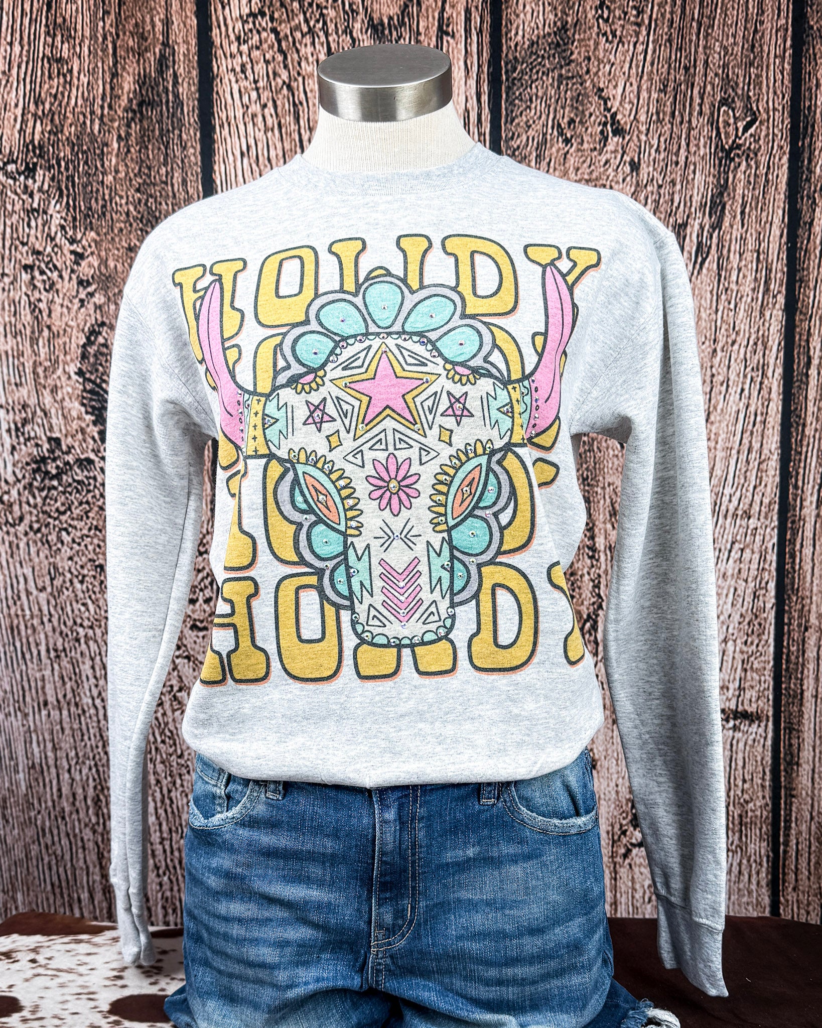 Make a bold statement with this Howdy bull skull sweatshirt, designed for the modern cowgirl who loves standout color with a polished western edge. Set on a classic gray base, the graphic features layered “Howdy” lettering behind a detailed bull skull filled with turquoise, pink, and golden tones. Subtle rhinestone accents add just the right amount of shimmer without overpowering the design.
