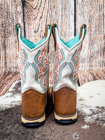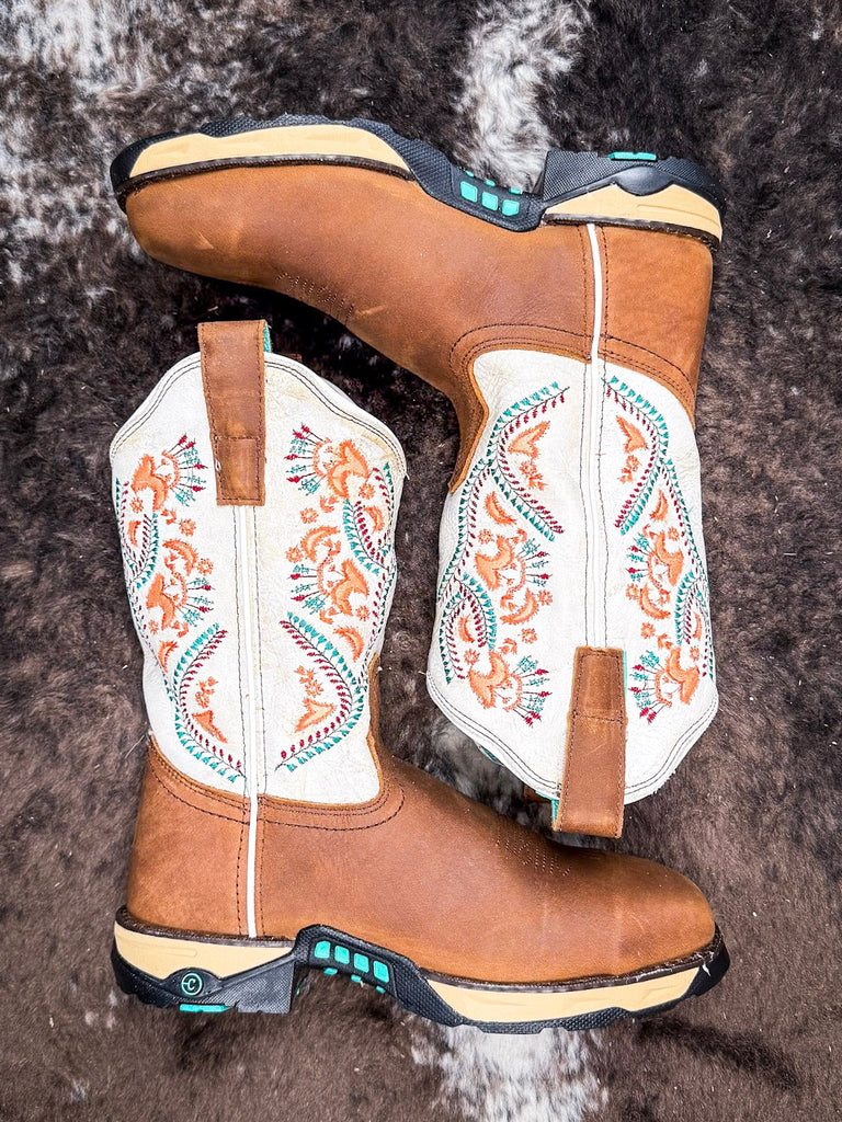 Crafted with genuine cowhide leather across the vamp, this boot means business. The shaft features a weathered cream finish layered with intricate floral embroidery in warm corals and turquoise tones—a look that’s bold without being too loud. At just 8” tall with a 9” lower shaft width, it’s designed for ease of movement and a lightweight feel, while still delivering full western soul.