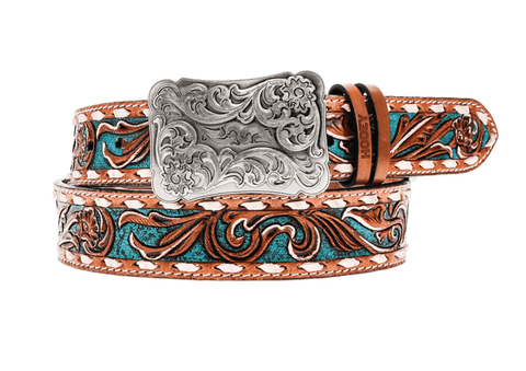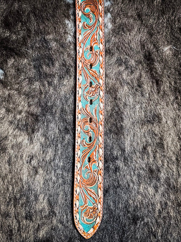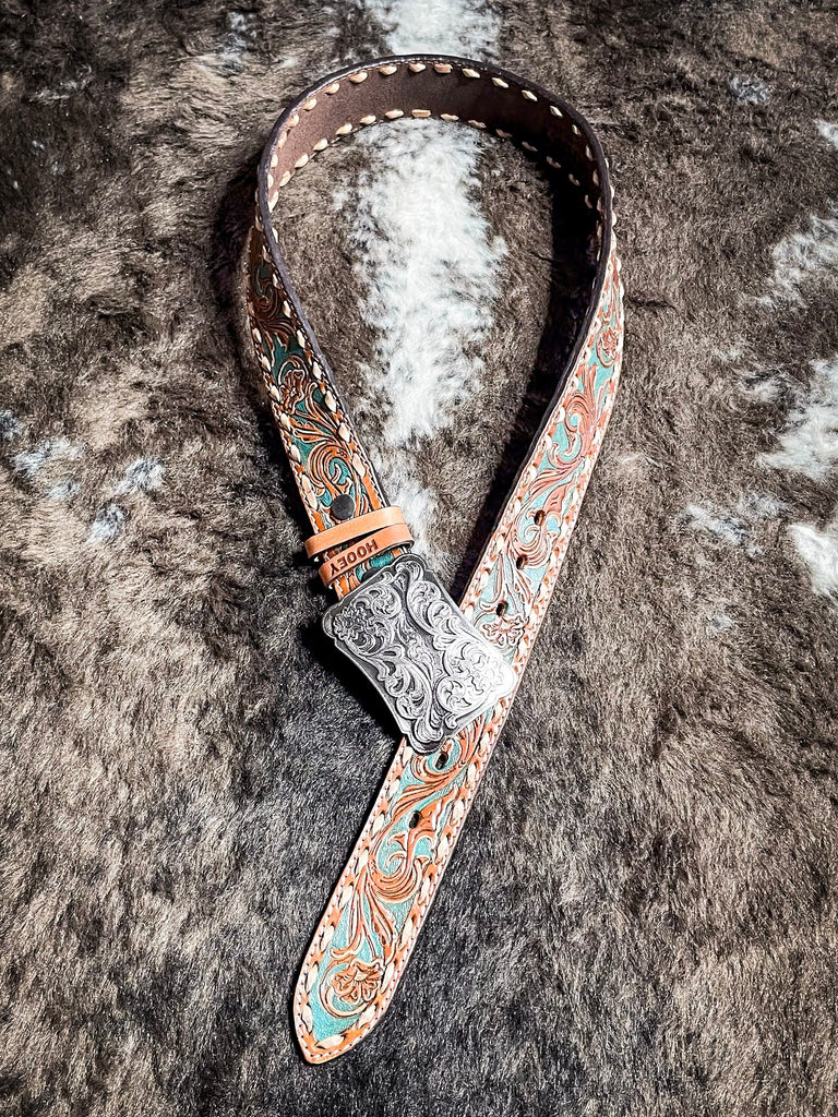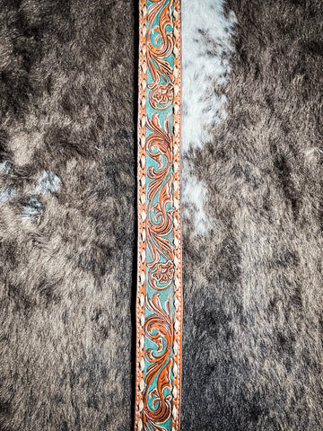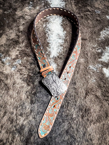 Crafted from genuine tan leather, the Sonoma belt features hand-tooled floral designs that bring out the natural beauty of the leather. Every pattern is carefully tooled by hand, giving the belt a rich, textured feel thatβs anything but ordinary. Around the edges, youβll find ivory buckstitching β a classic touch that gives it a bold, clean finish β while the hand-painted turquoise accents add just the right amount of color and pop. Itβs got that perfect mix of tradition and a little bit of fun.