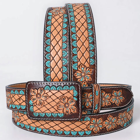 Crafted from premium genuine leather, it showcases a warm tan base framed by rich chocolate edges and turquoise highlights that make each floral design pop. The sturdy tooled buckle completes the look, giving this belt both durability and personality.