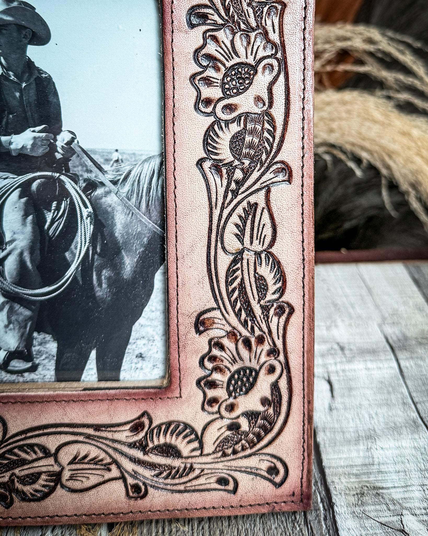 The detailed floral tooling and stitched edges give it that heirloom look, like something you’d pass down or keep on display for years. It’s bold enough to stand on its own, but still easy to style on a shelf, desk, or mantel without overpowering your space.