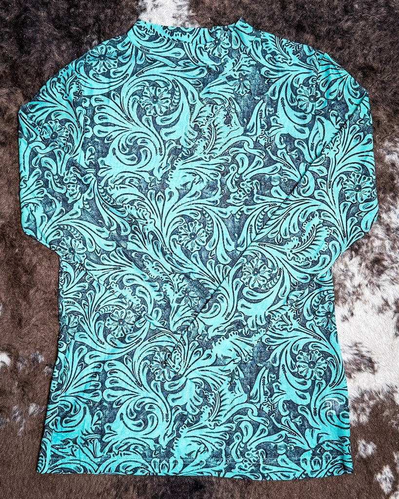This Tooled In Turquoise Top is for all the wild ones out there! With its turquoise tooled print mesh fabric and long sleeves, you'll add some serious style to any occasion. Get ready to shine!