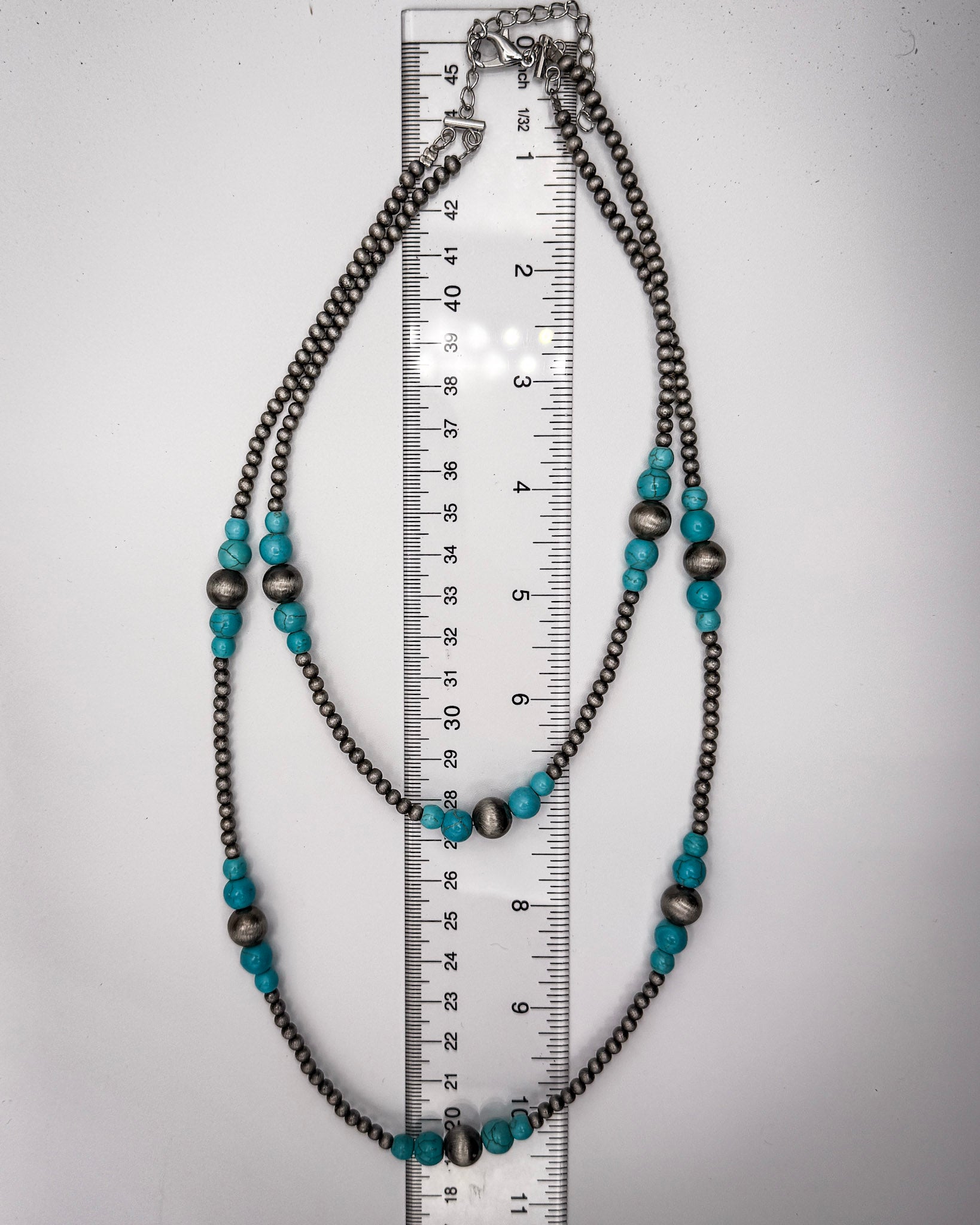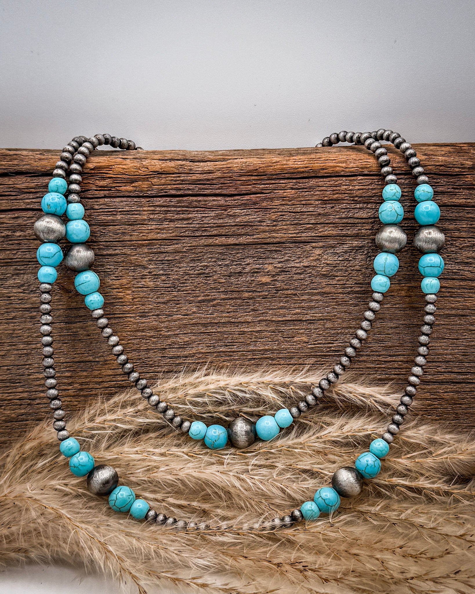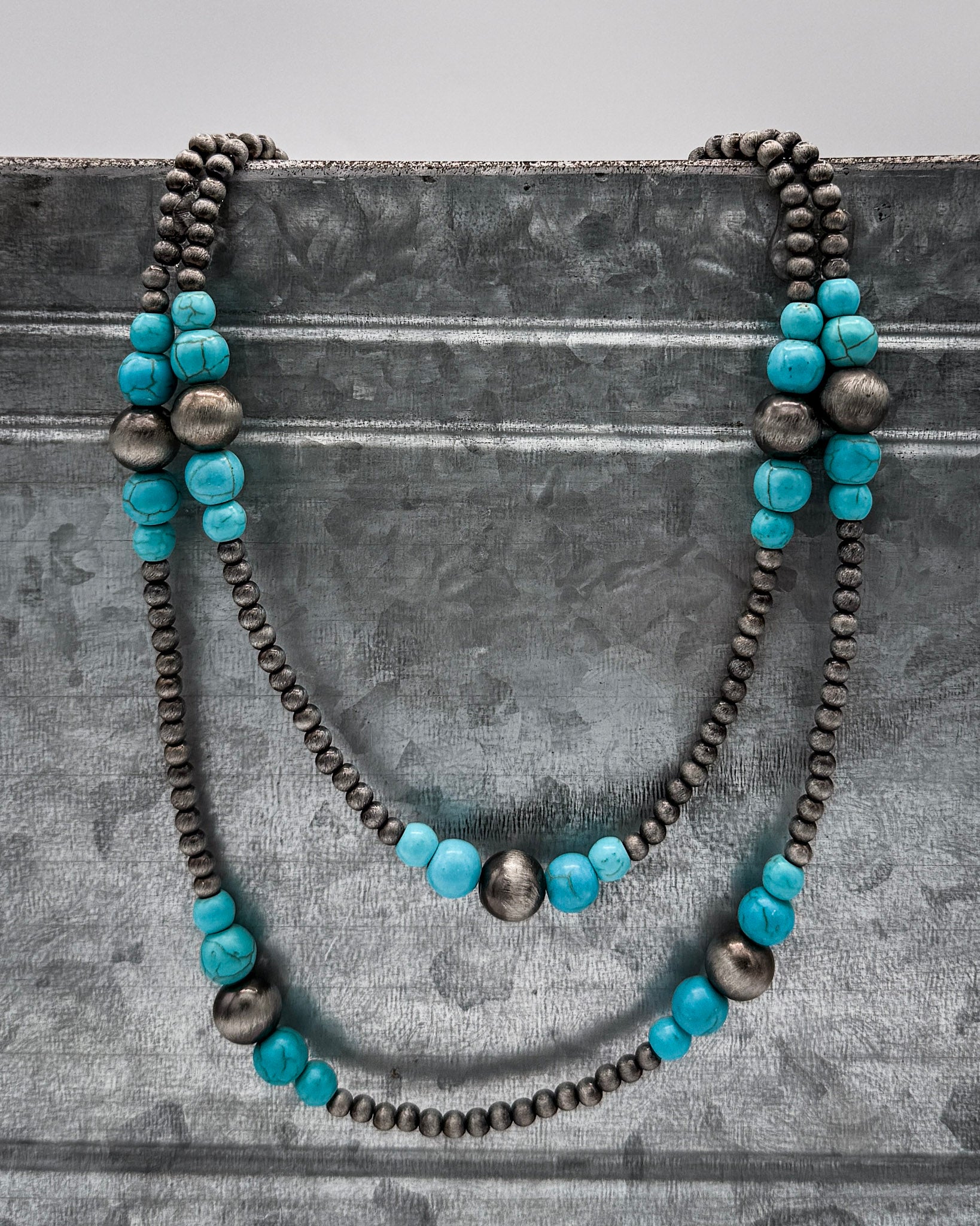 • The Turnback Trail Layered Necklace was made for long days and wide-open spaces. This double strand design brings together silver-toned faux pearls and pops of faux turquoise beads for a look that feels equal parts ranch-ready and pulled together.