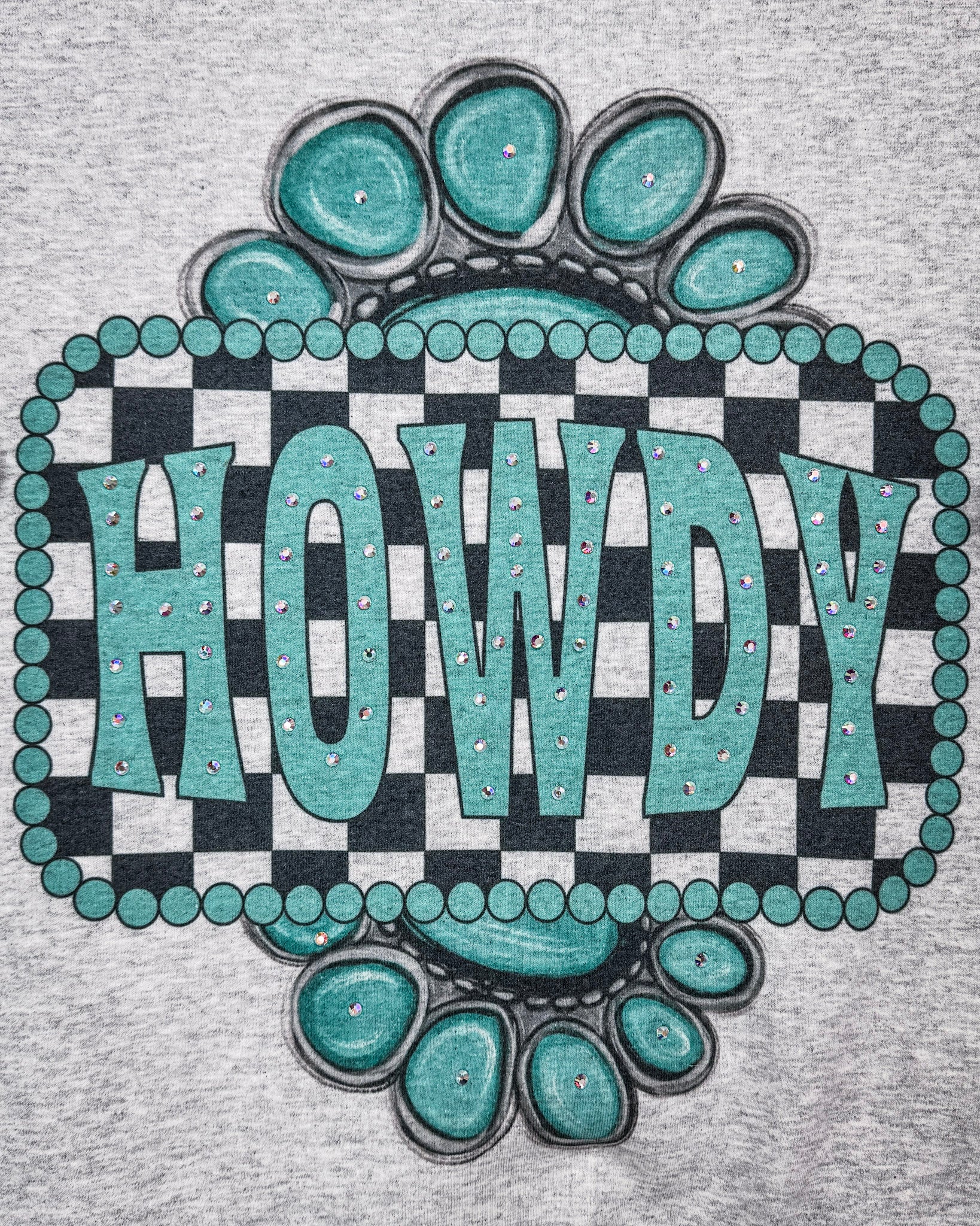 This turquoise Howdy sweatshirt brings bold western style and modern detail together in the best way. Set on a classic gray base, the graphic features vibrant turquoise lettering layered over a black and white checkered background, framed with a statement concho inspired design. Subtle rhinestone accents add a hint of shimmer that catches the light without overpowering the look.