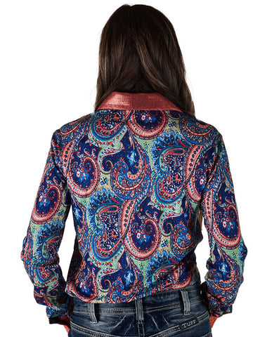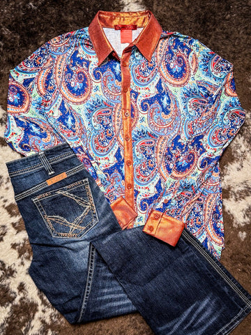 The Twilight Tessa Pullover Button-Up is one of those tops that just stops you in your tracks. With a striking paisley pattern in bold blues, fiery oranges, and deep reds, it brings a whole lot of energy without ever trying too hard. It’s finished with subtle rust foil accents that shimmer just enough to catch the light—think Western flair with a polished edge.