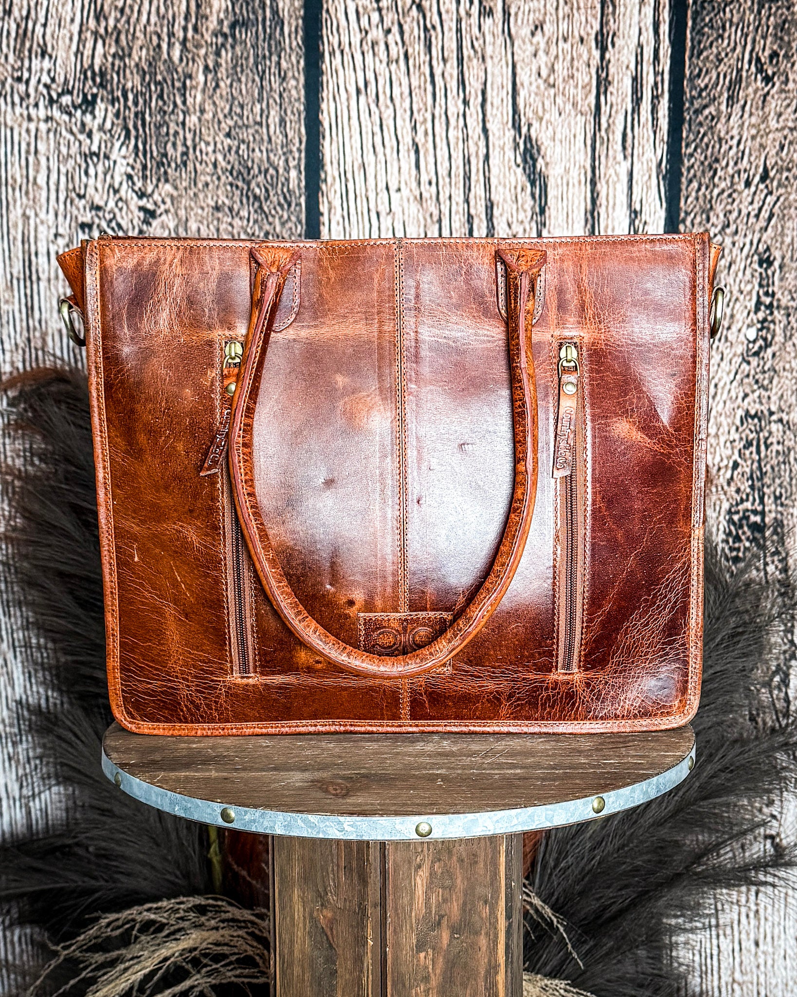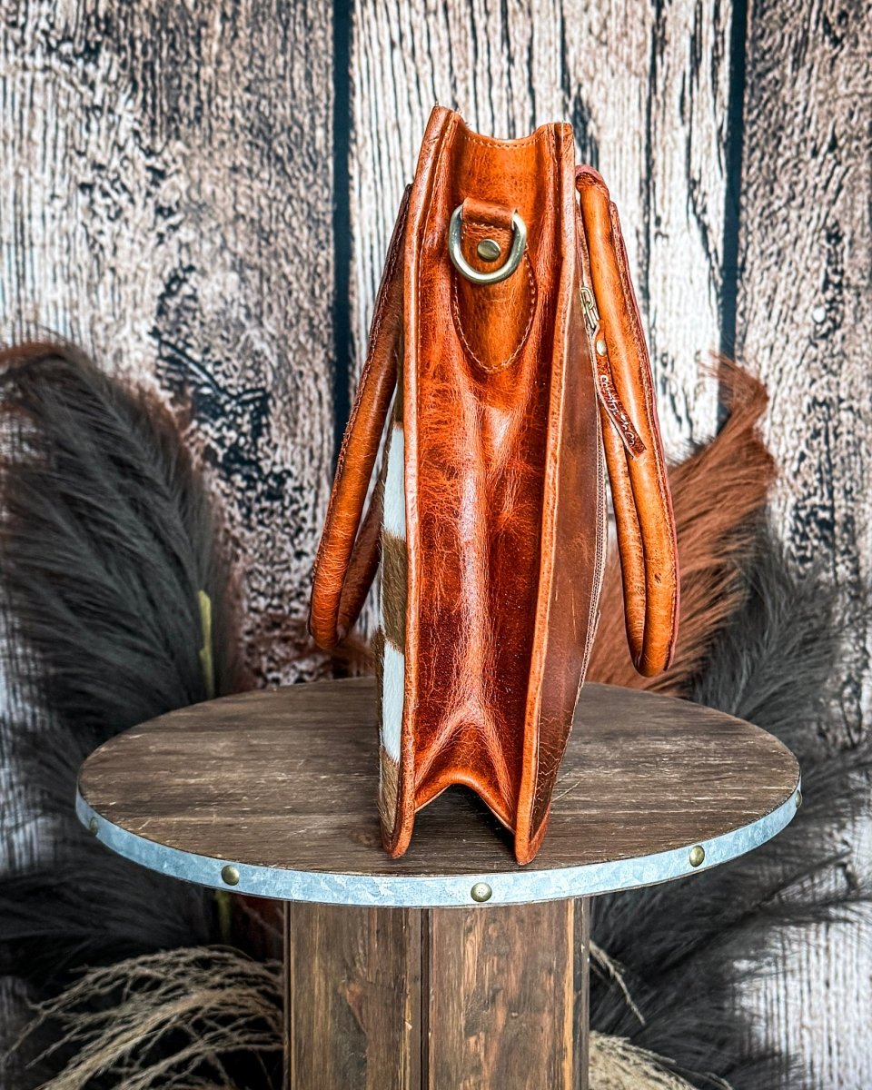 • Meet your new everyday go-to—the Virginia Checkered Leather & Hide Tote Bag. This one’s got that perfect mix of laid-back style and real-life function. The checkered cowhide front paired with that rich, sun-faded leather gives it a look that feels lived-in in the best way.