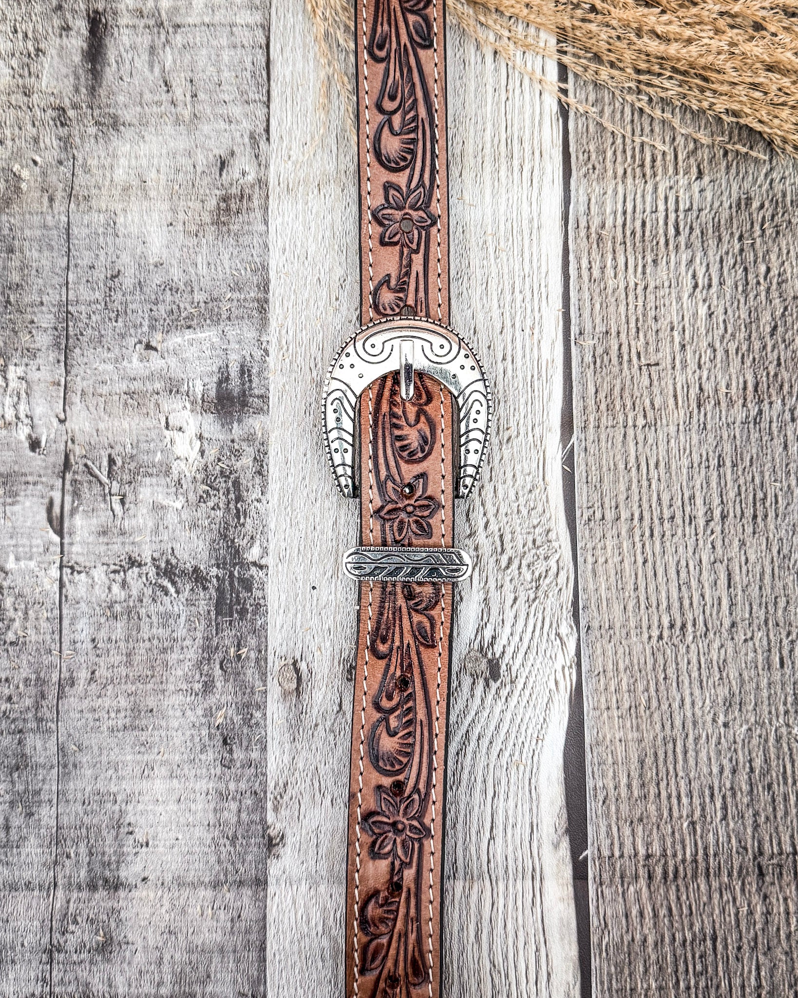 The hand-tooled leather brings that rich, detailed western feel, while the center panel of brown and white hair-on hide adds just the right touch of texture. It’s one of those pieces that feels thoughtful and elevated, even though it’s super easy to use day to day.